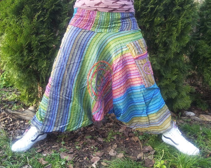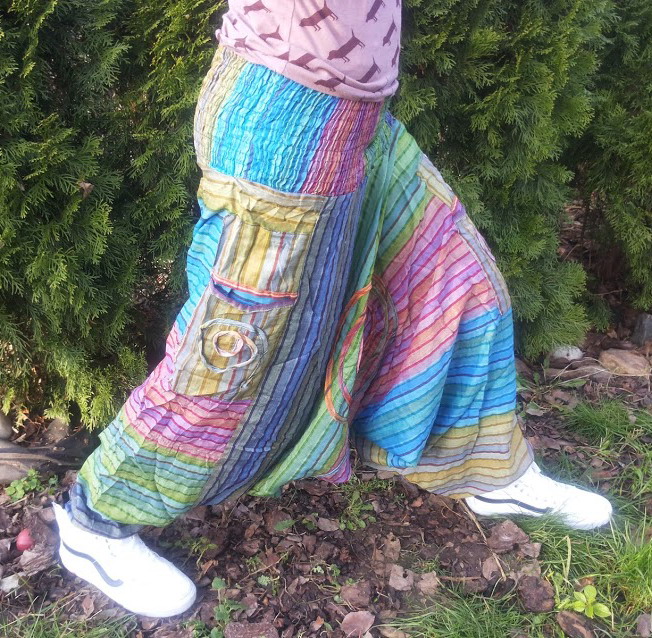 Nádherné, pohodlné, vzdušné indické nohavice. Voľný strih, sed padá až ku členkom, pri členkoch jedna voľnejšia gumka, vďaka ktorej nohavice pristanú každej postave. Materiál 100% bavlna. Pás maximálne elastický. Univerzálna veľkosť, ručíme univerzálnosťou pre čísla od XS až po 2 XL!