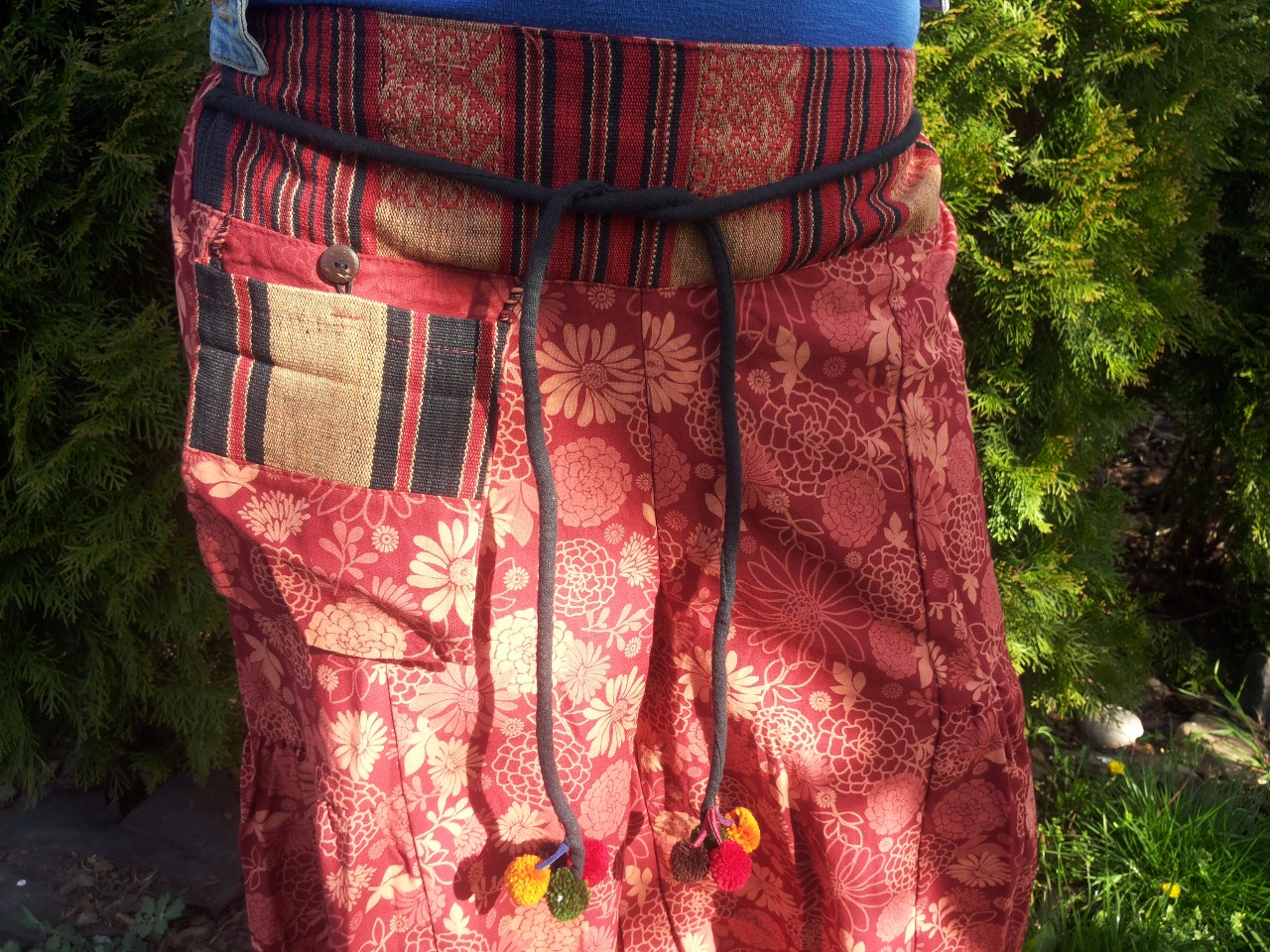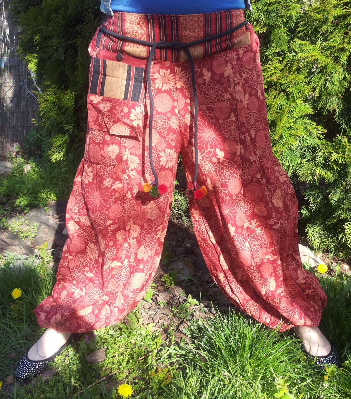 Kvalitné, krásne a pohodlné nohavice s plnou dĺžkou, s padnutým sedom, pás je na gumu, ozdobné šnúrky s efektnými brmbolčekmi a jedným praktickým a pekným vreckom, na spodku nohavíc je gumička. 100% bavlna, veľkosť je univerzálna pre čisla S,M,L,XL. Farba tehlová s kvetinovými vzormi. Sú tie pravé pre skĺbenie pohodlia a originality :)