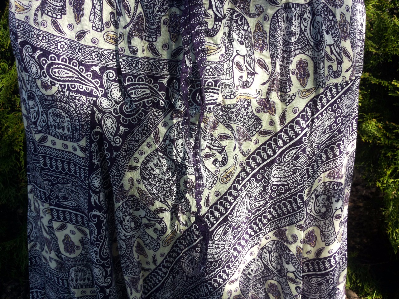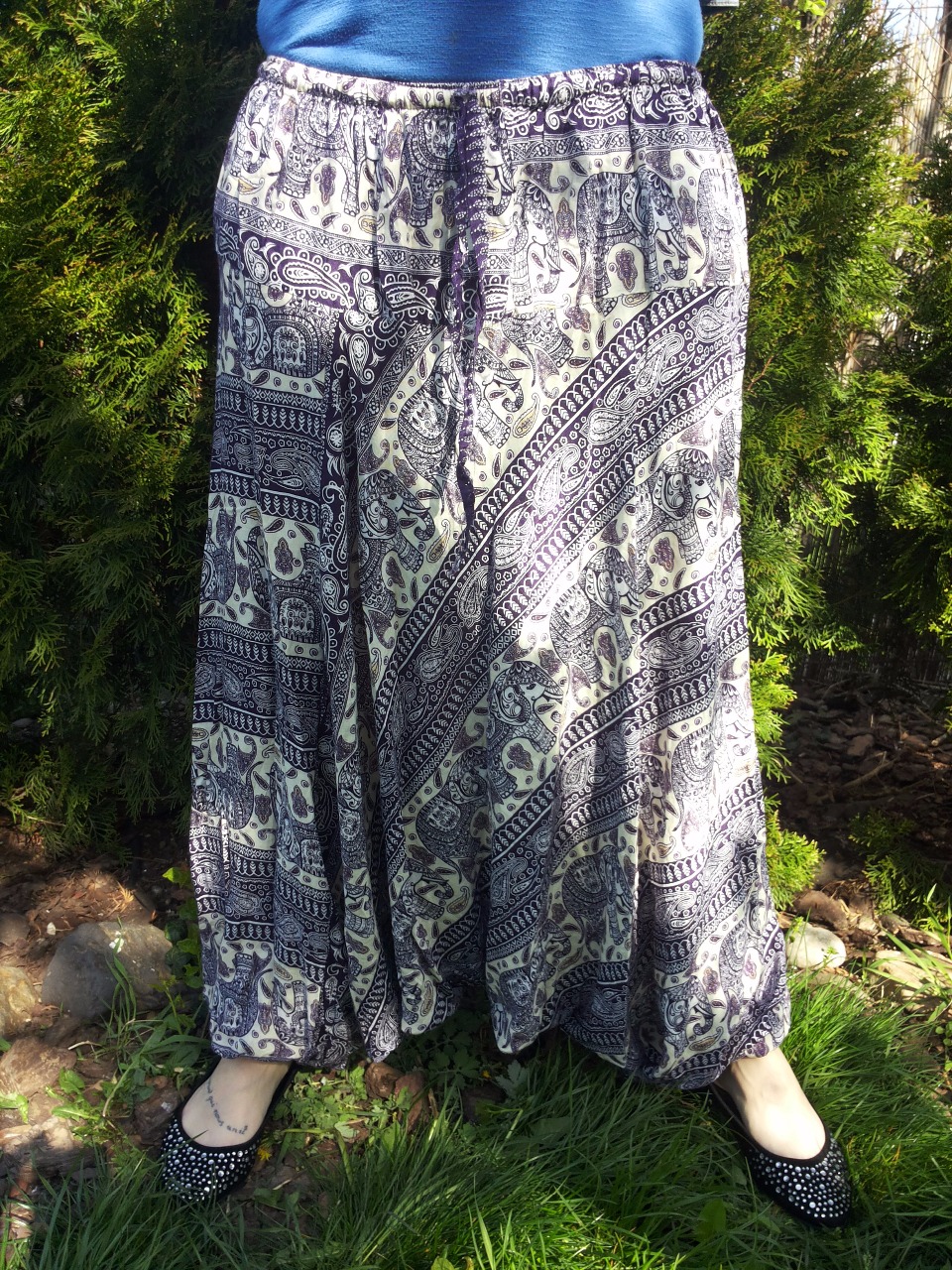 Nádherné,vzdušné, štýlové a maximálne pohodlné nohavice. Sed až po členky, pripomínajú aj sukňu, čo zvyšuje spôsoby nosenia. V páse aj na členkoch je gumička. Materiál 100% rayon-indická chladivá bavlna. Farby-fialová, béžová, rôzne krásne vzory. Univerzálna veľkosť pre čísla S,M,L,XL,XXL.
